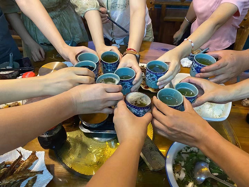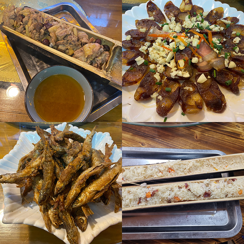 夜幕降臨,整個平安寨都安靜了下來,大家圍桌而坐,共同舉杯,吃著當地的美食“竹筒雞”和“竹筒飯”不亦樂乎,米飯香糯可口,還有一股竹子清香味,真的是人間美味呀!