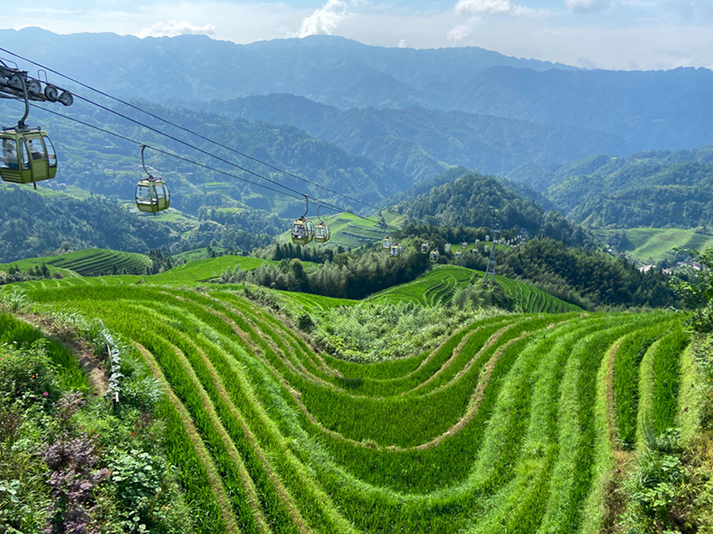 次日早上8點我們坐上擺渡車由平安寨抵達了金坑大寨停車場,坐上纜車直達金佛頂。在纜車艙內,可以俯瞰著蜿蜒的山道和層層疊疊的梯田,感受到壯麗景色帶來的震撼。